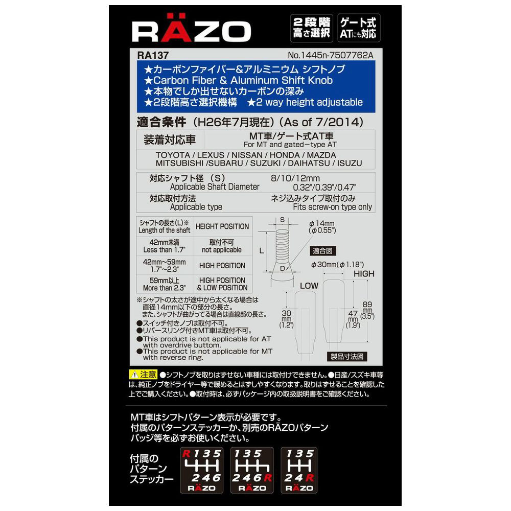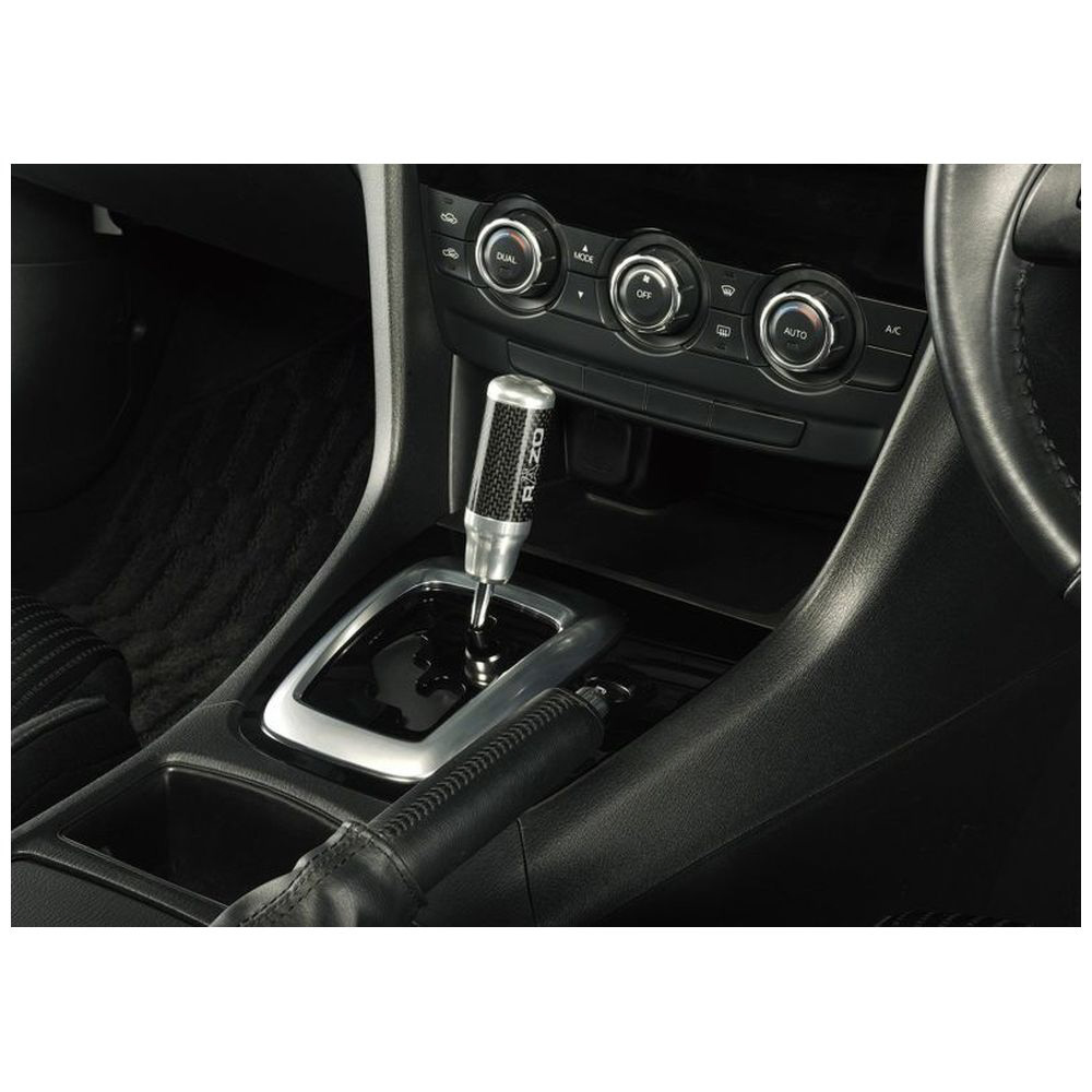 カーボンファイバーとアルミニウムを組合わせたシフトノブ。2段階高さ選択機構で好みのポジションを選択可能。シフトシャフトからの高さはローポジション時は30mm、ハイポジション時は47mm。ゲートAT車にも対応。対応シャフトネジ径: 8mm、10mm、12mm。