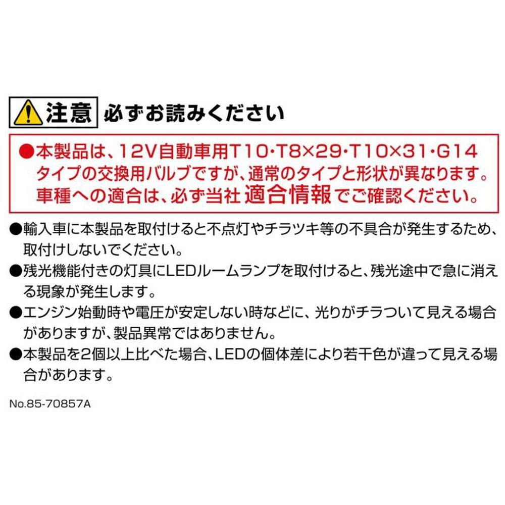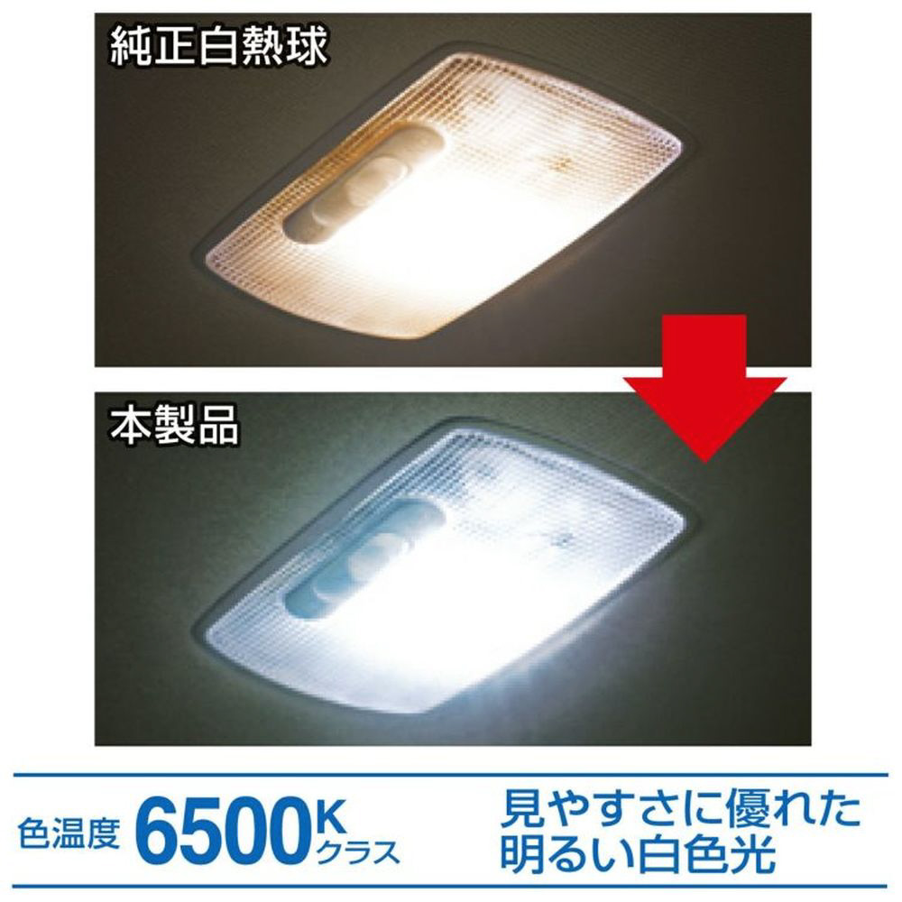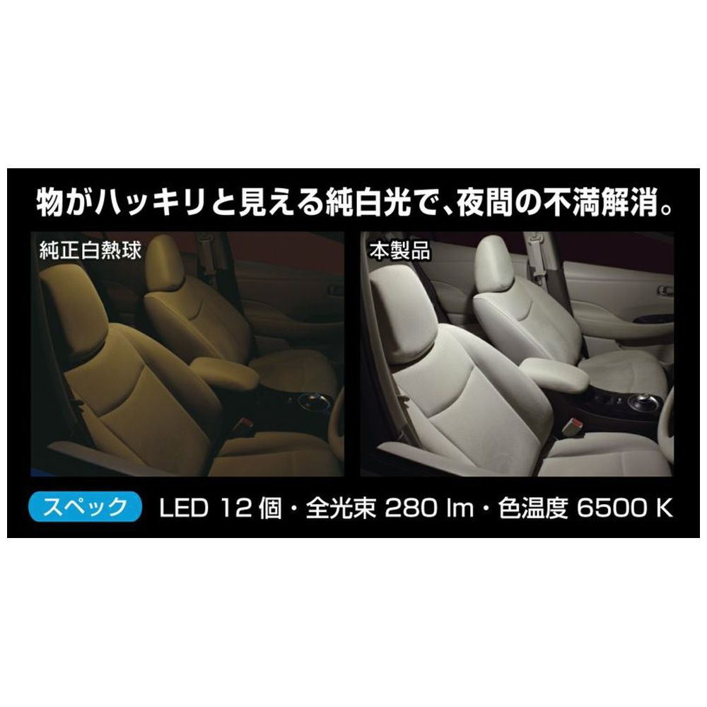 高輝度LEDを12個搭載したLEDルームランプ。フロントルームランプやセンタールームランプに装着することで室内の隅々まで照射。高い実用性をもった高性能LEDバルブ。4つの口金に対応することで高い汎用性を実現。●対応バルブタイプ: T10/T8×29/T10×31/G14●色温度: 6500K●全光束: 280lm●消費電力: 2.82W