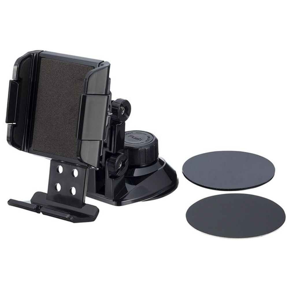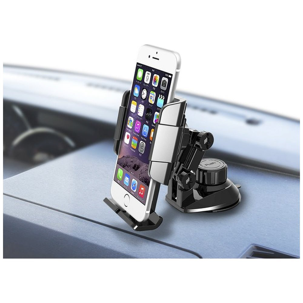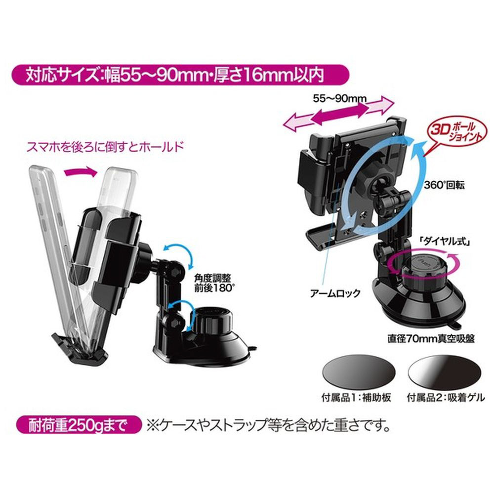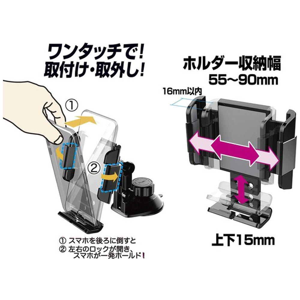 ワンタッチで固定・解除できるスマホホルダー。幅55〜90mm、厚さ16mmのスマホに対応。吸盤タイプで取り付け簡単。