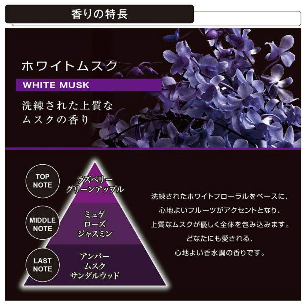 洗練されたホワイトフローラルをベースに、心地よいフルーツがアクセントとなり、上質なムスクが優しく全体を包み込みます。どなたにも愛される、心地よい香水調の香りです。