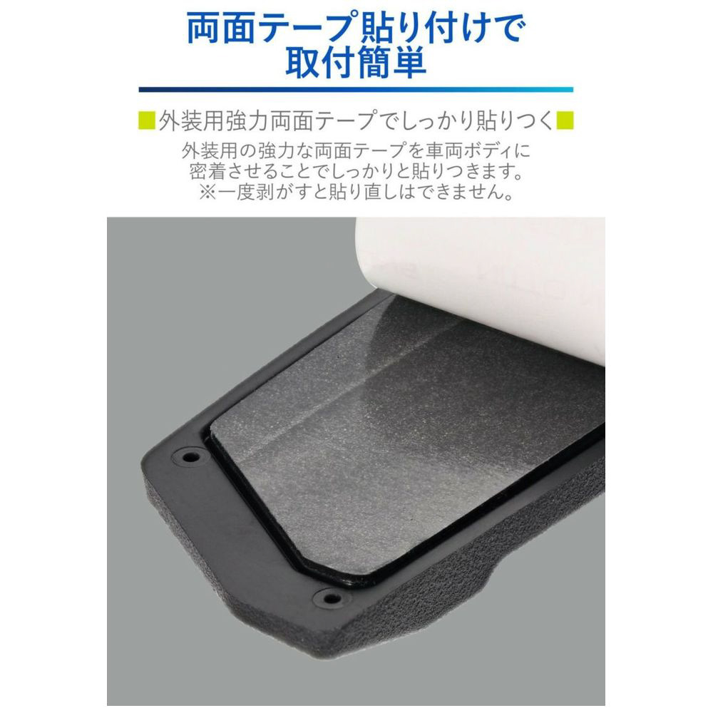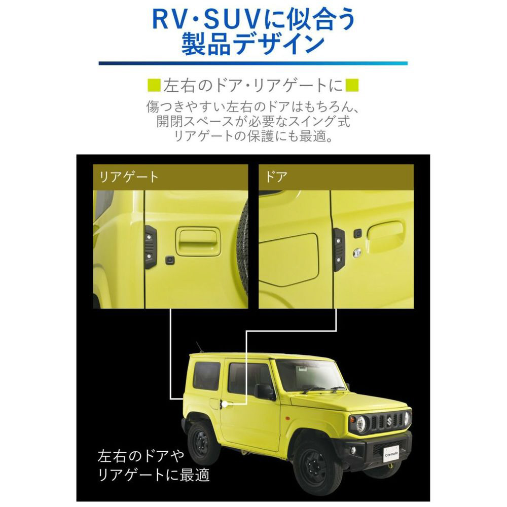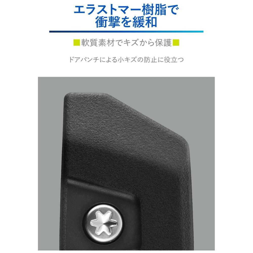 エラストマー樹脂製ボディで衝撃を緩和。貼り付けた面をキズから守ります。左右のドアの他、リアゲートにも適しています。