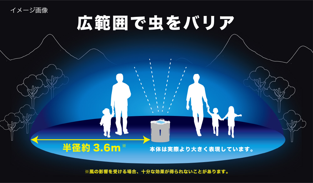 屋外で半径3.6mの広範囲エリアで虫をバリア。快適な空間で過ごせます。
