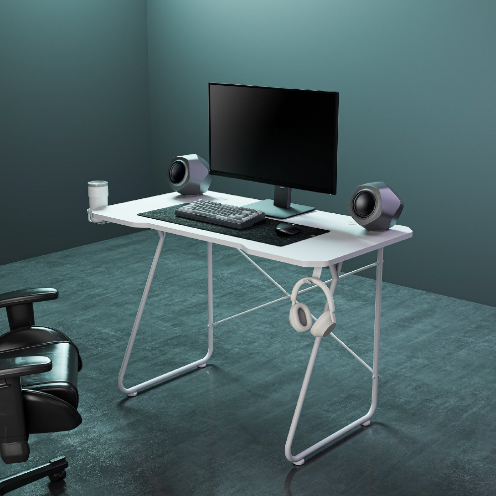 デスクの横揺れを抑えるクロスバーと高さ調整ネジで安定したゲーム環境を。便利なヘッドホンフックとドリンクホルダーも付属しています。