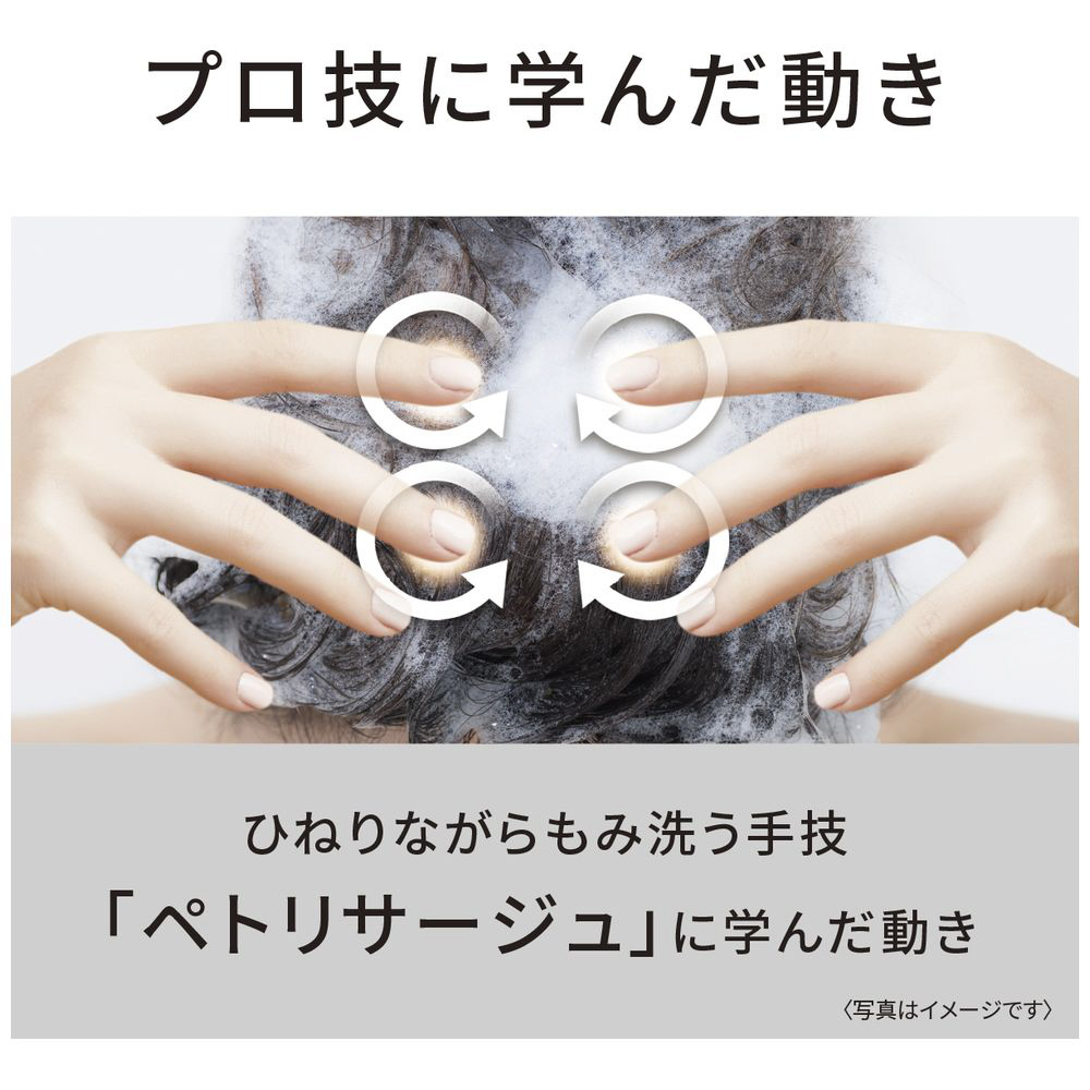 指先を使って頭皮を寄せたり、ひねりながらもみ洗う手技「ペトリサージュ」に学んだ動き。