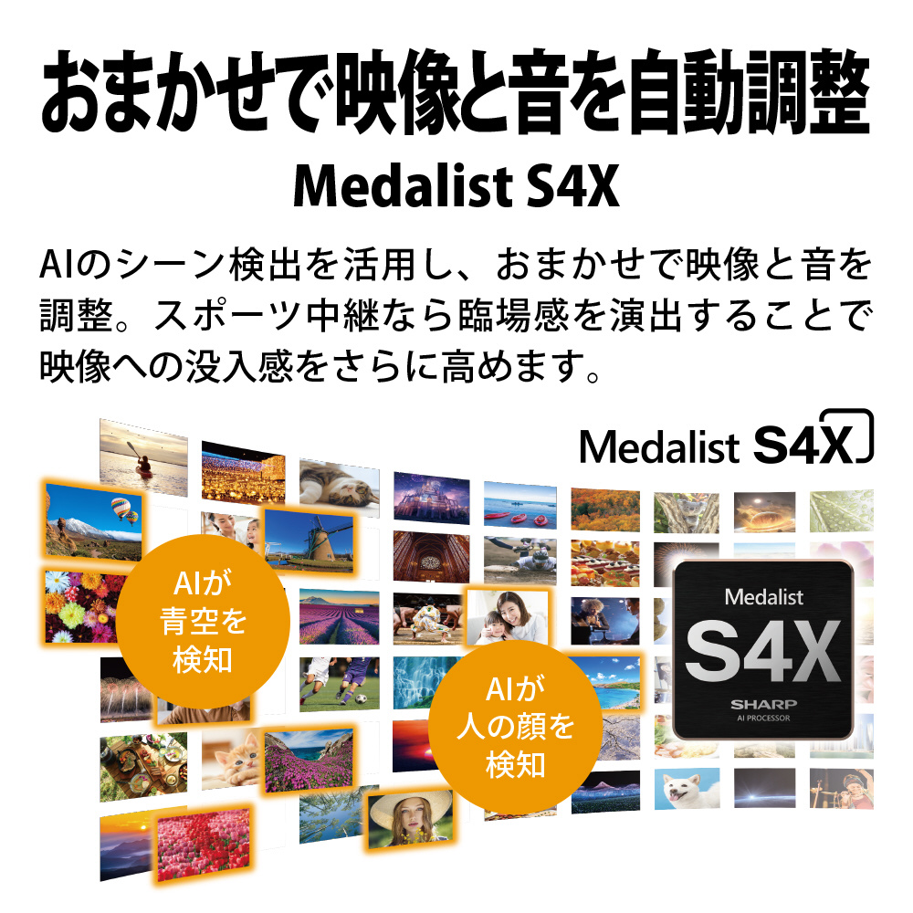 ・新開発、AI高画質/高音質プロセッサー搭載の画像処理エンジン「Medalist S4X」を搭載。AIが見ている映像を検知し、最適な色彩や明るさなどを自動で調整。さらには、ニュースやドラマでは人の声がより聞き取りやすくするなど、音声も自動で調整してくれます。