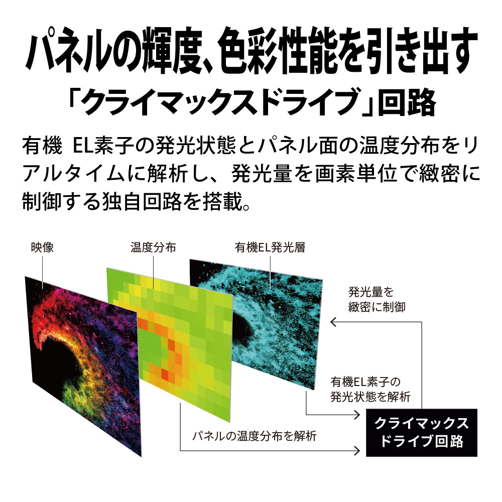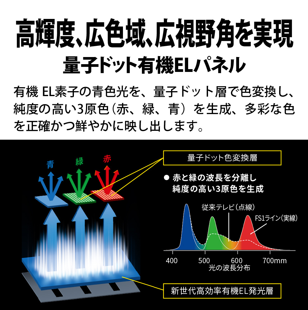 ・高輝度、広色域、広視野角を実現する「量子ドット有機EL(QD-OLED)パネル」を採用。純度の高い3原色を表示する技術により、多彩な色を鮮やかに表現すると共に、広い視野角特性により様々な角度からも美しい映像が楽しめます。