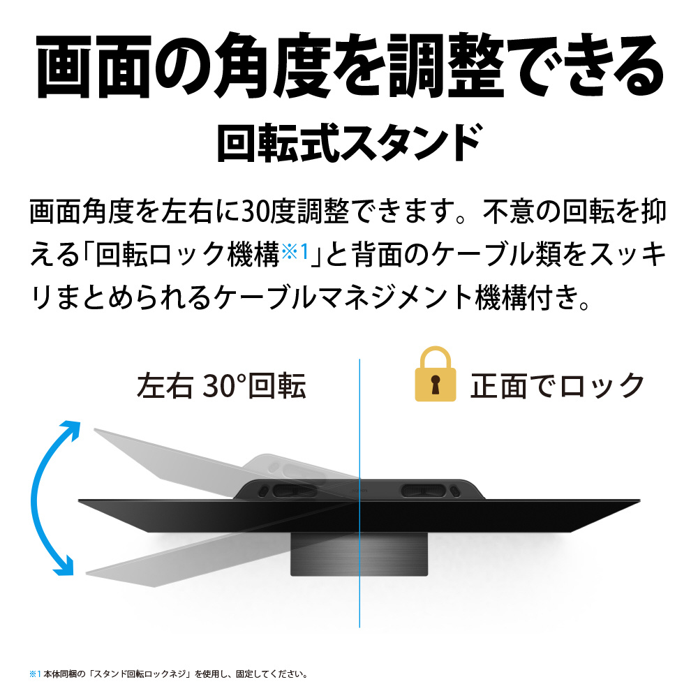・省スペースで設置できる回転式スタンド採用。見る位置によって画面の向きを変えれるだけではなく、掃除や配線の際にも非常に便利です。