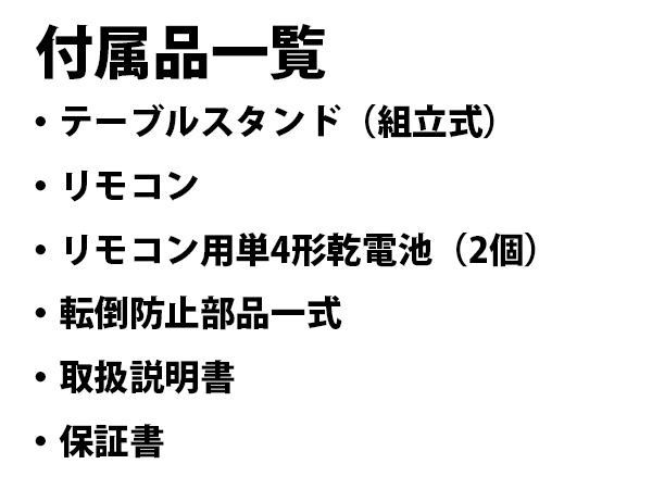 | 付属品 | テーブルスタンド(組立式)、リモコン、単4形乾電池(2個)、転倒用防止ベルト一式、取扱説明書、保証書 |