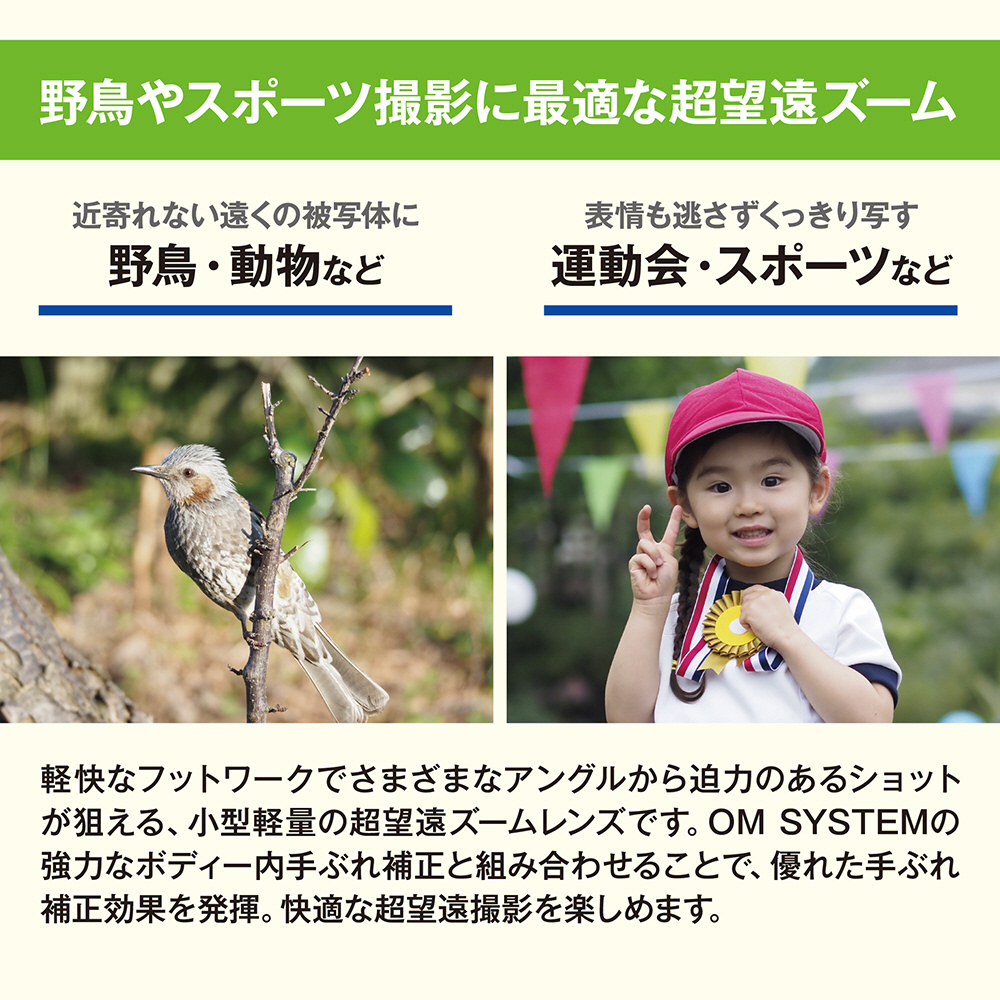 野鳥やスポーツ撮影に最適なマイクロフォーサーズマウントの超望遠ズーム。小型軽量なので、軽快なフットワークで様々なアングルから迫力のあるショットが狙えます。