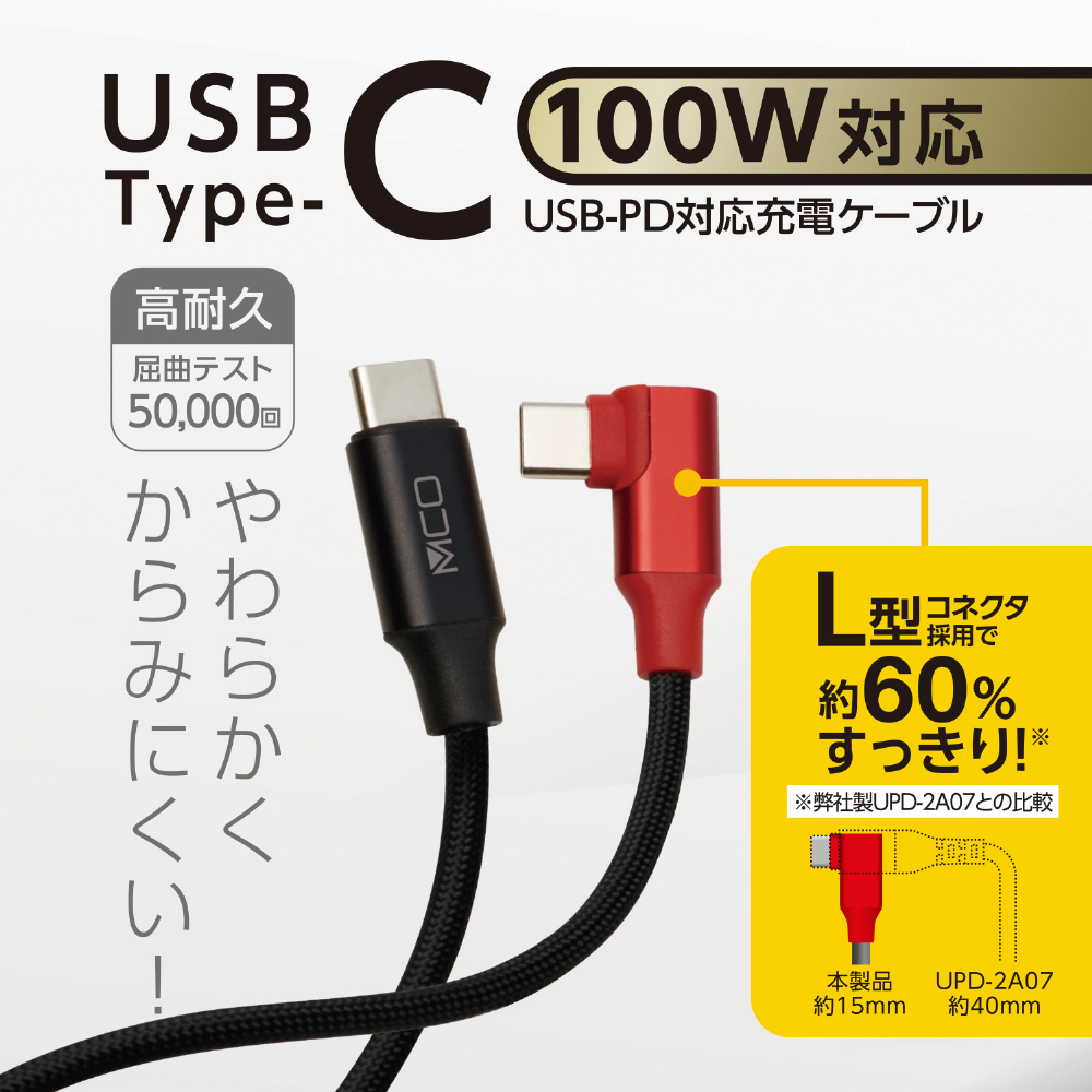 USB PD 対応でeMarker内蔵のL字型USB Type-C 充電ケーブル