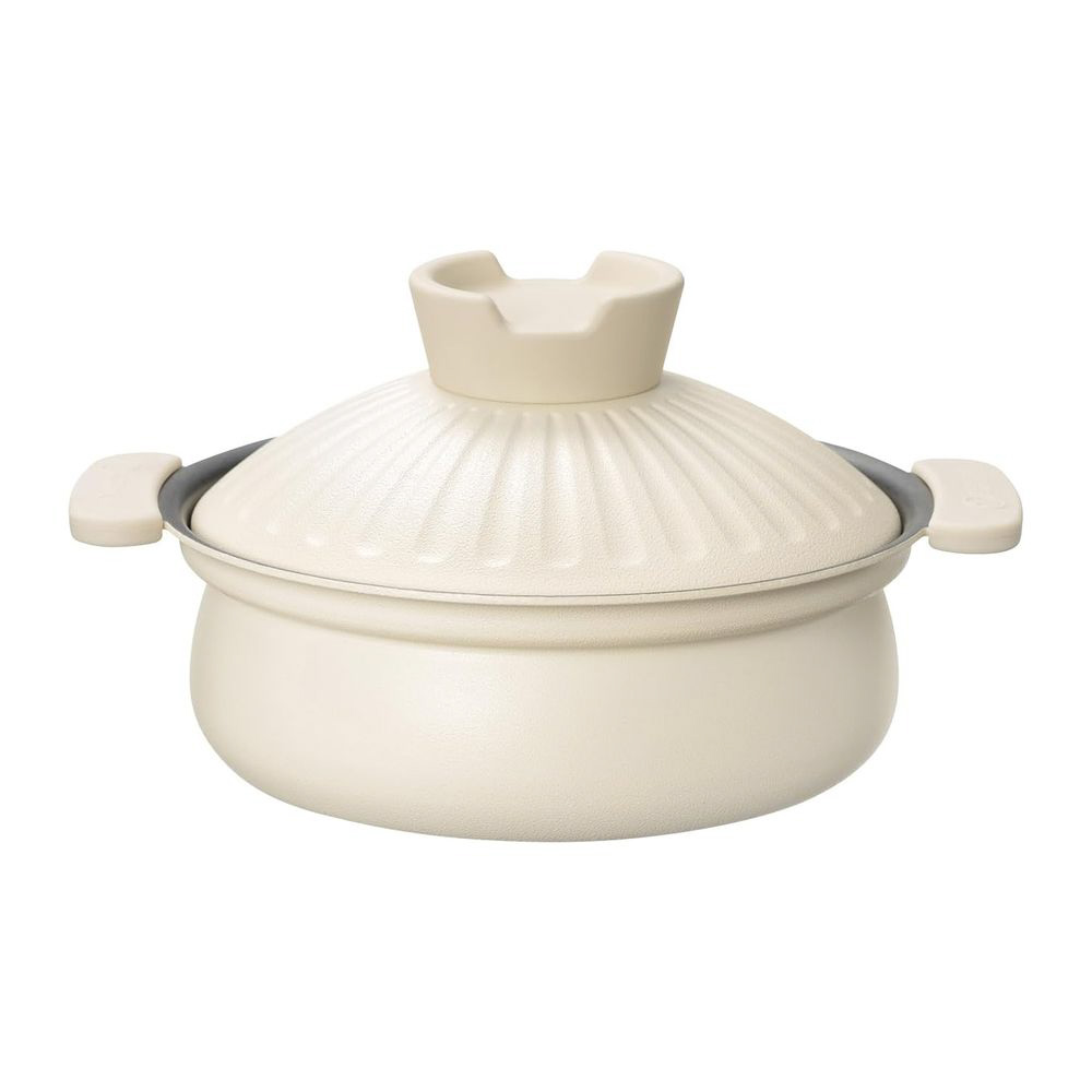 IH対応で卓上で使える軽量な20cmホワイトの卓上鍋。お玉や菜箸を蓋に置ける便利な設計。丸洗いできお手入れも簡単。