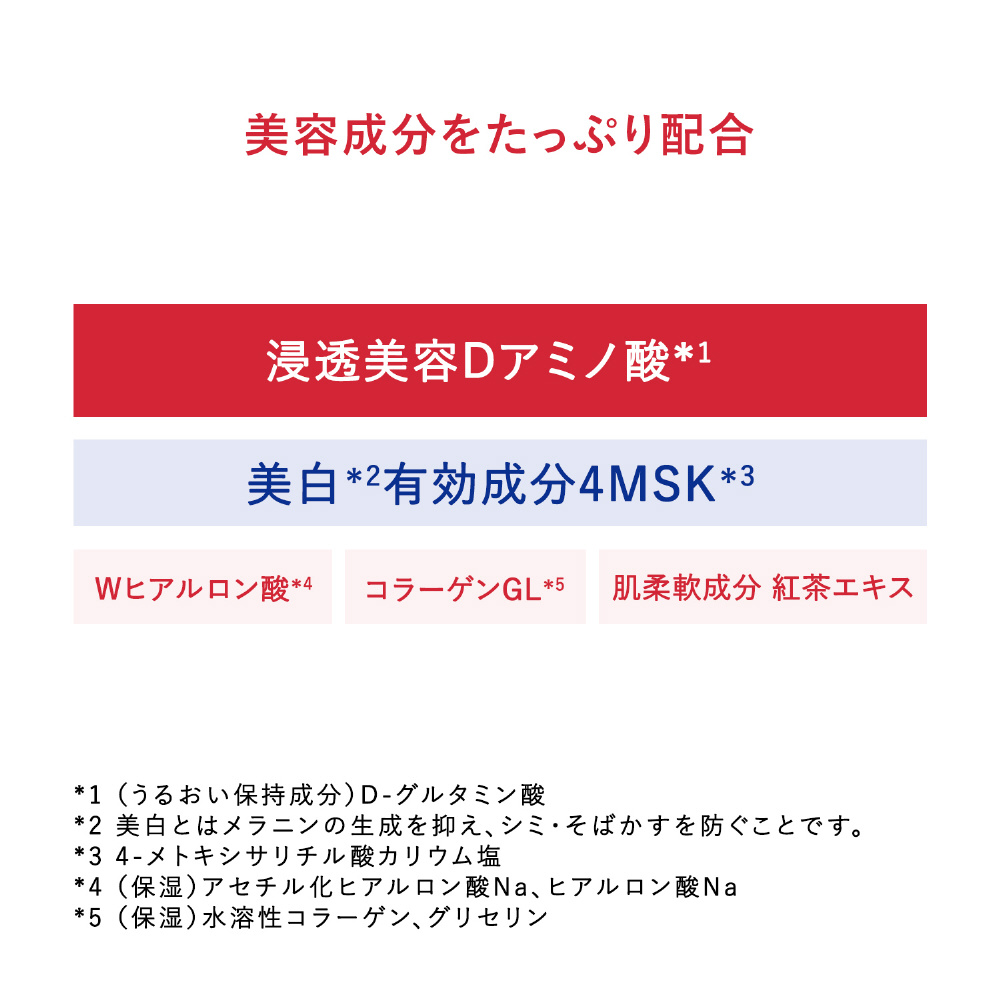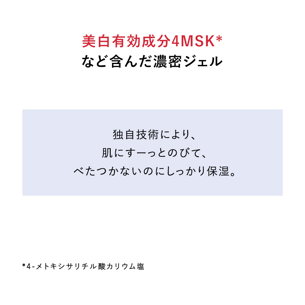 じゅわ〜っと浸透*、ふんわり密封。 うるっと明るい透明美肌。 濃密ジェルクリームがキメの奥までじゅわ〜っと浸透。うるおって、明るく透明感のある肌へ。 美白ケアのためのオールインワン。 美白とは、メラニンの生成を抑え、シミ・そばかすを防ぐこと。 *角層まで