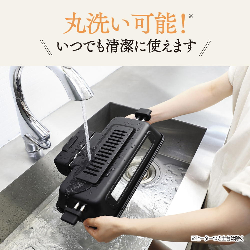 ・分解したふた、ステンレス製焼き網、こんがり反射板、水受皿はすべて丸洗い可能なので気になる汚れをしっかりお手入れできて、きれいに使えます。※本体 ・ ヒーターは丸洗いできません(布拭きはできます)