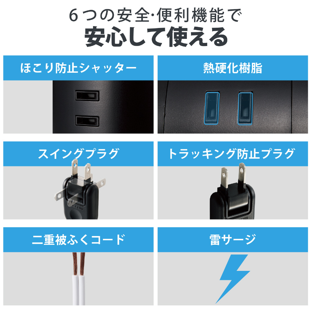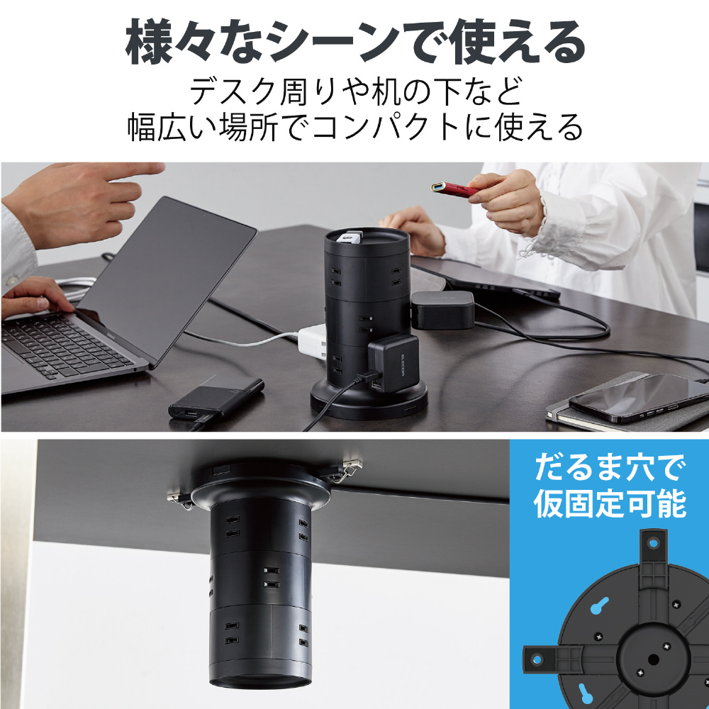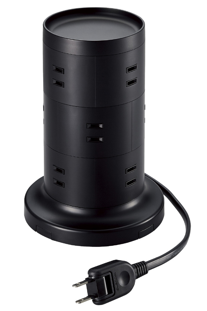 比較的小さな面積で設置ができ、360度あらゆる方向から接続できる12個の差込口を備えたタワー型の電源タップです。製品上部はトレー形状になっており、一時的に取り外した充電器などの小物を収納しておくことができます。二重構造の差込口やホコリ防止シャッターなどの安全機能、雷ガードやスイングプラグなどの便利機能を備えた使いやすい製品です。