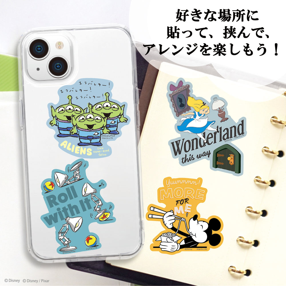 スマートフォンケースに挟むのにオススメなディズニーキャラクターデザインのステッカーです。スマートフォンとクリアケースの間に挟み込んで、自分好みにアレンジ出来ます。ツヤを抑えたマットタイプ。PVC素材で耐光性・耐水性に優れ、スマートフォン以外にもご使用頂けます。