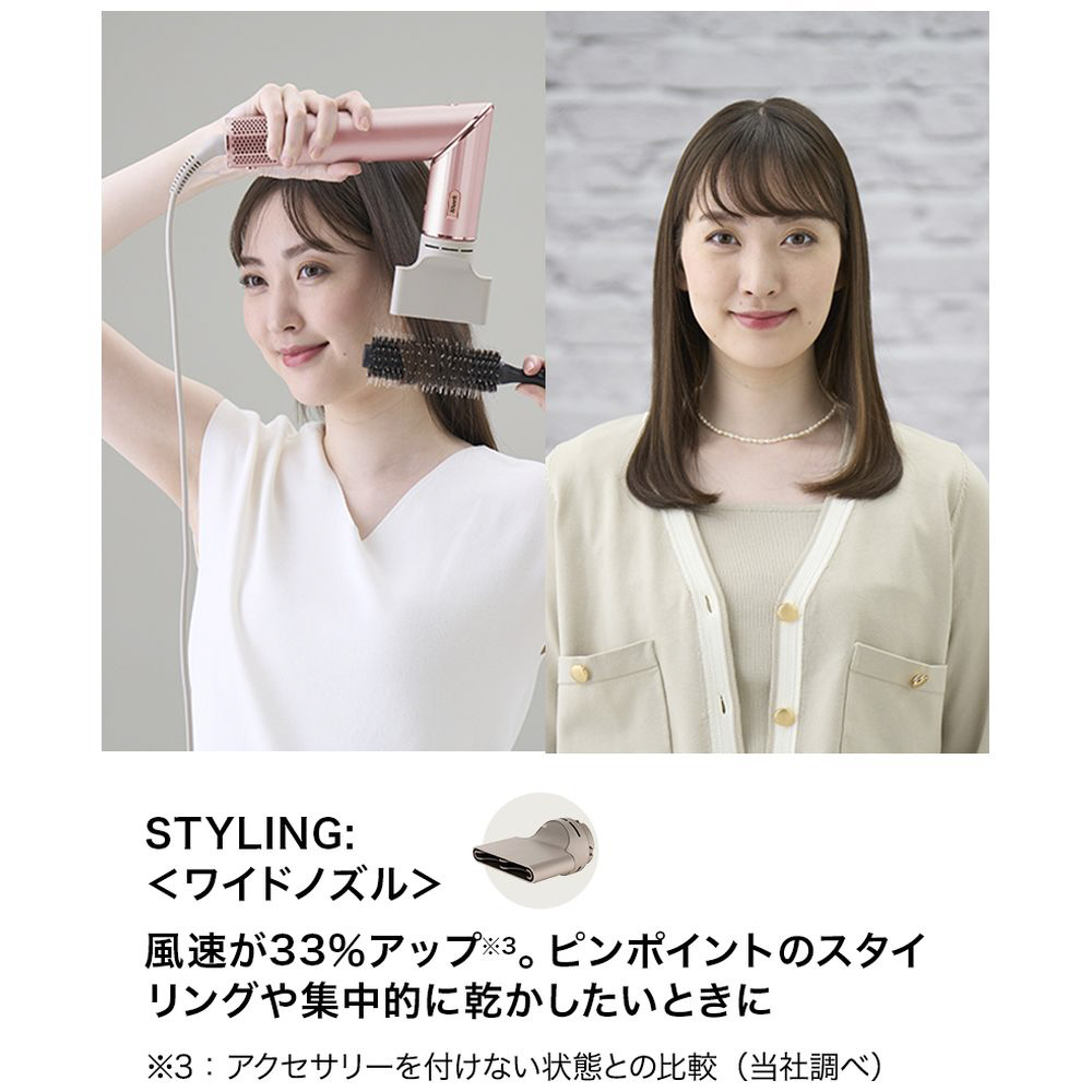 ■ワイドノズルをつけると風が絞られ風速アップ。ポイントのスタイリングや集中的に乾かしたいときに最適。