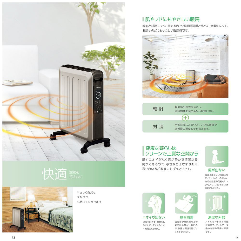 様々な生活シーンに溶け込むやさしい暖房機。熱伝導率の高いアルミの特性を活かした高密着FIXALヒーター搭載。輻射+対流による温度ムラのない暖房。フロアLED搭載で、運転ON/OFFにかかわらずお部屋の電気を消しても優しい明るさで足元を照らすことができます。家族みんなにやさしい安全・安心設計。こだわりの安全&便利機構。空気を汚さず、肌やノドにもやさしい暖房。オイルを使用しないから軽く、4輪キャスター付きでラクラク移動。3パターンプログラムタイマーや設定簡単入タイマー搭載で多彩なタイマー運転が可能で、更にリモコン付きで使いやすい。ecoモード搭載でワンタッチ省エネ運転。