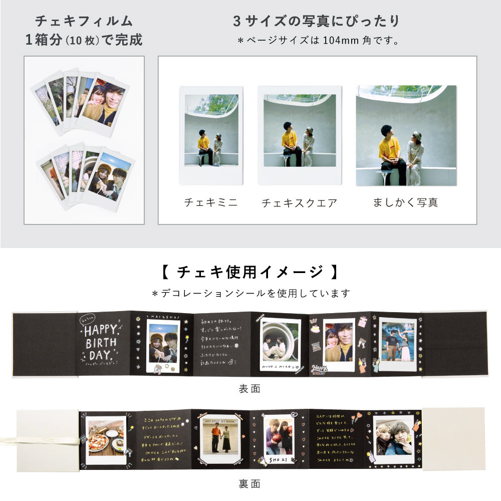 チェキプリントや、ましかく写真がぴったり貼れるサイズ。写真を 10〜12 枚貼るだけで完成です。