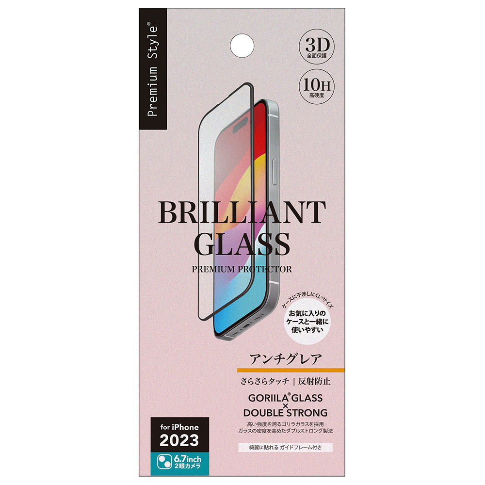 iPhone 15 Plus ガイドフレーム付 液晶全面保護ガラス BRILLIANT 2度強化/ゴリラガラス アンチグレア Premium Style PG-23CGLW03AG