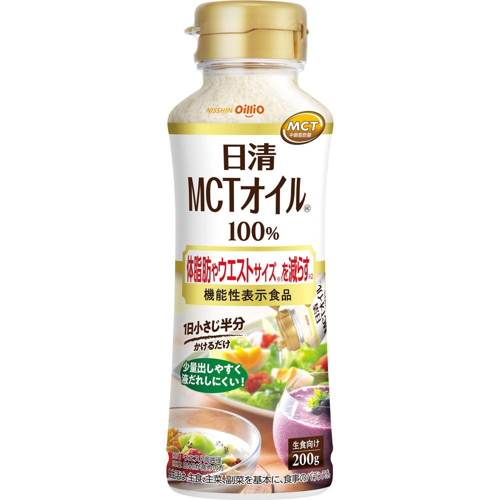 MCT(中鎖脂肪酸油)100% の食用油。BMIが高めの方の体脂肪や内臓脂肪、ウエストサイズを減らす機能性表示食品です。味やにおいが少ないので、いつもの料理や飲み物の味そのままでお使いいただけます。