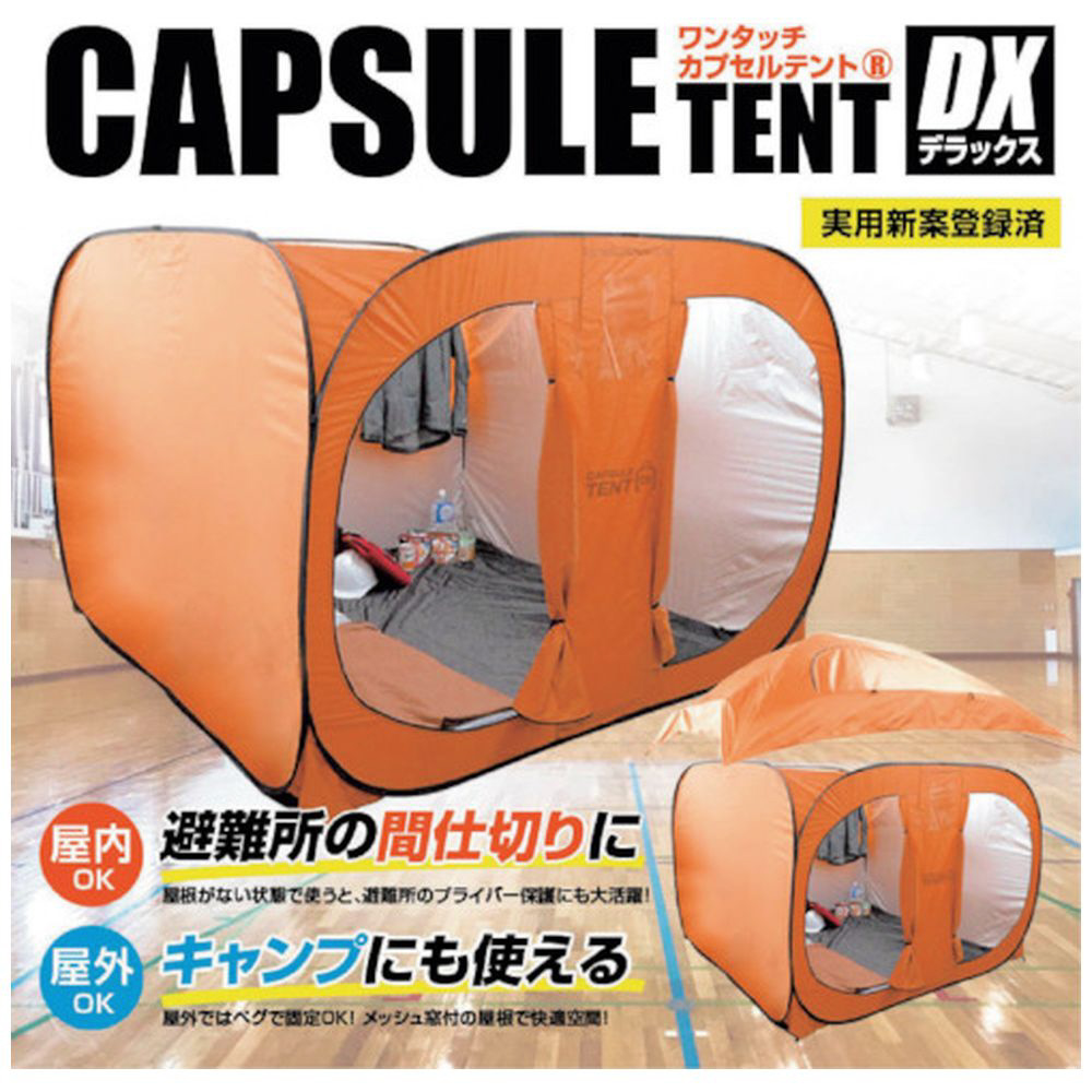 実用新案登録済のカプセルテントDXは、どこでも簡単に設置可能で、そこが個室に早変わりします。テントはワンタッチで組み立て可能で、特に難しい作業無くカンタンです。使い方は、アウトドアテント、災害時の防災テント、防災用トイレテント、着替え用テントなどとして、自由に使用可能です。約210×210cmの広さで、高さは約200cm(最高部)もあります。屋根は取り外し可能です。