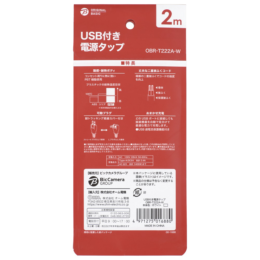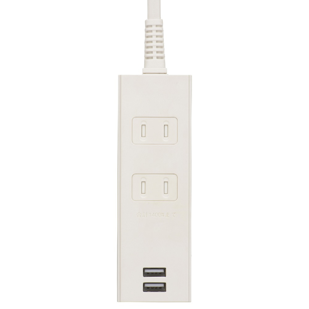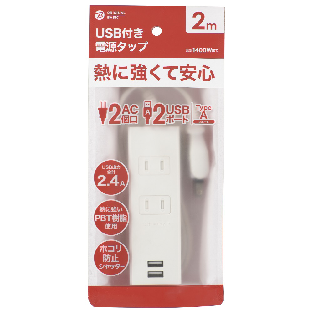 | 商品名 | USB付き電源タップ 白 OBR-T222A-W [2.0m /2個口 /スイッチ無 /2ポート] |