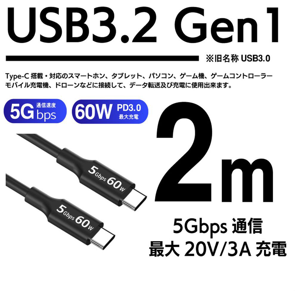 Type-Cケーブル(C-C) 2m USB3.2 Gen1 / 5Gbps / PD3.0 / 最大60W(20V3A)