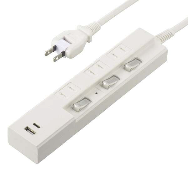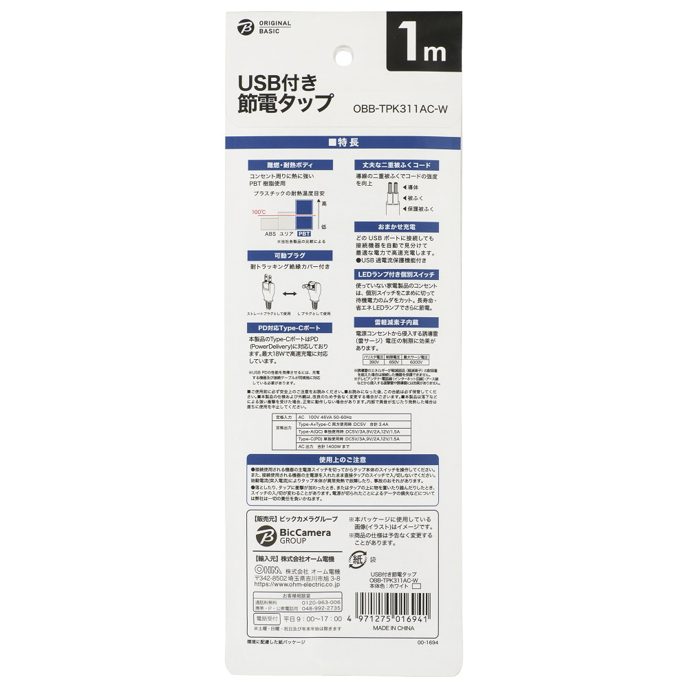 | 商品名 | USB付き節電タップ Type-Cポート付 白 OBB-TPK311AC-W [1.0m /3個口 /スイッチ付き(個別) /2ポート] |