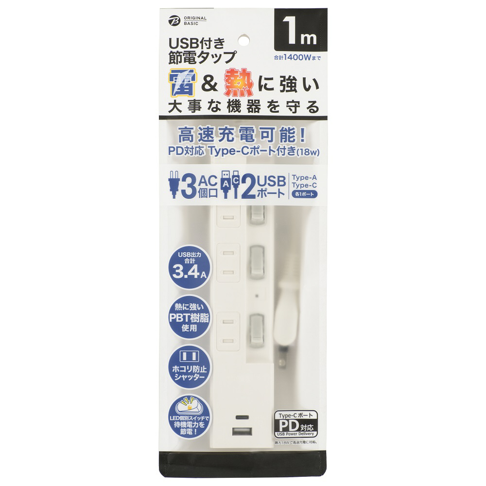 USB付き節電タップ Type-Cポート付 白 OBB-TPK311AC-W [1.0m /3個口 /スイッチ付き(個別) /2ポート]