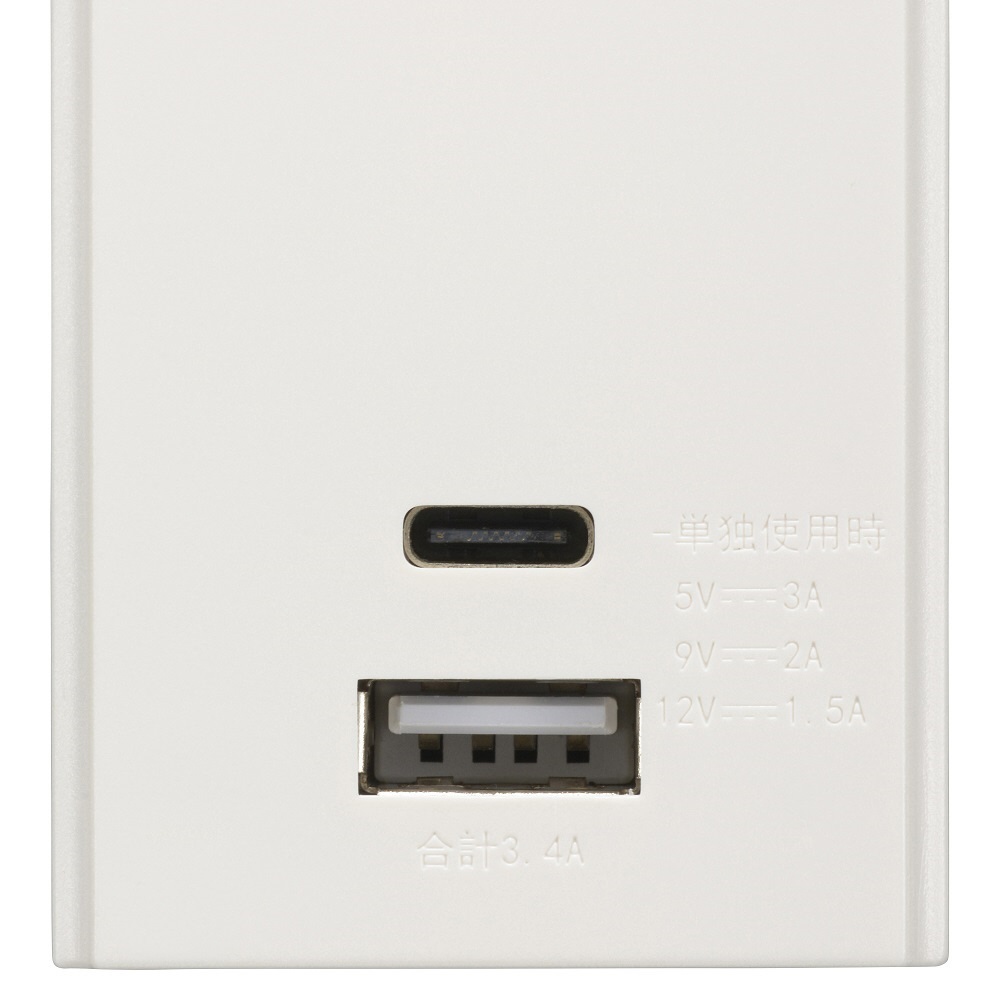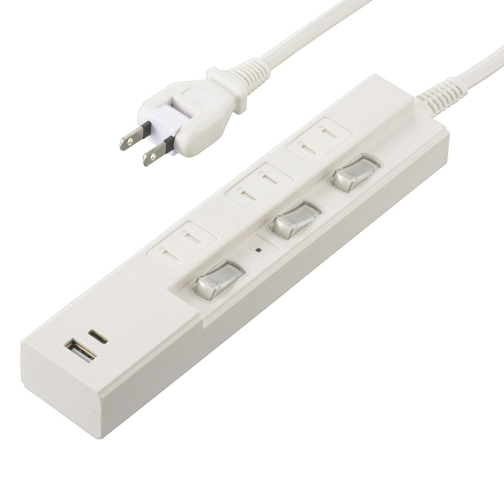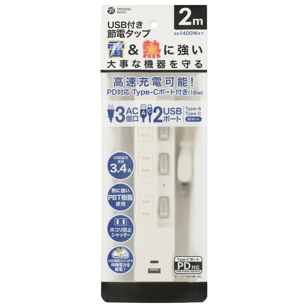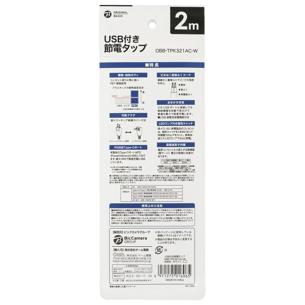| 商品名 | USB付き節電タップ Type-Cポート付 白 OBB-TPK321AC-W [2.0m /3個口 /スイッチ付き(個別) /2ポート] |