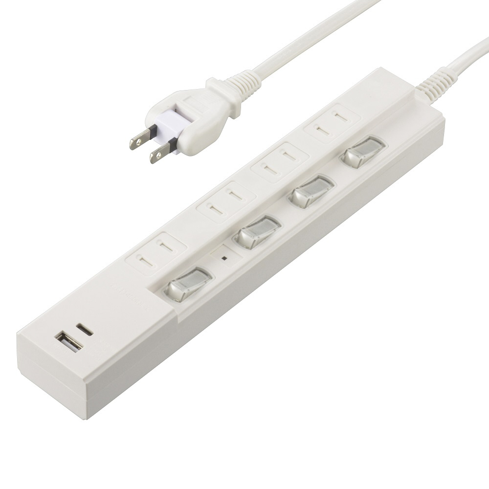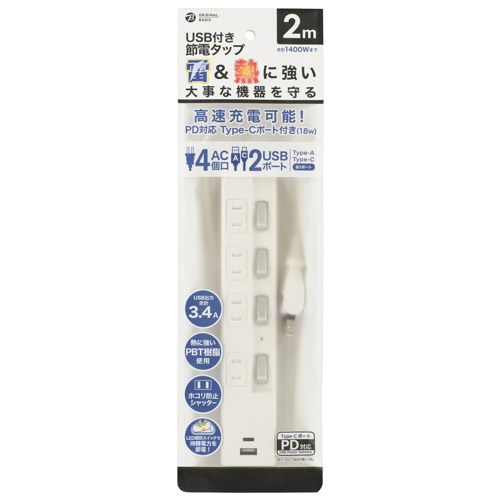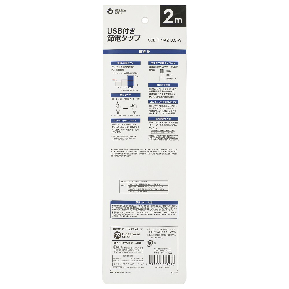 | 商品名 | USB付き節電タップ Type-Cポート付 白 OBB-TPK421AC-W [2.0m /4個口 /スイッチ付き(個別) /2ポート] |