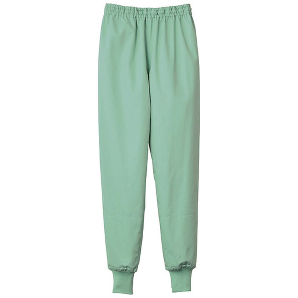 異物混入対策仕様のスタンダードの常温作業場向けホッピングパンツです。ウエスト総ゴム、共紐入り、ゴム取替え口、ファスナーなしです。本体裾口はフライス、インナー裾口はゴム入りです。右前ウエスト裏スナップボタン式キーポケット付きです。縫い代は巻き伏せ縫い、ホワイト、サックス、グリーンの3色展開です。