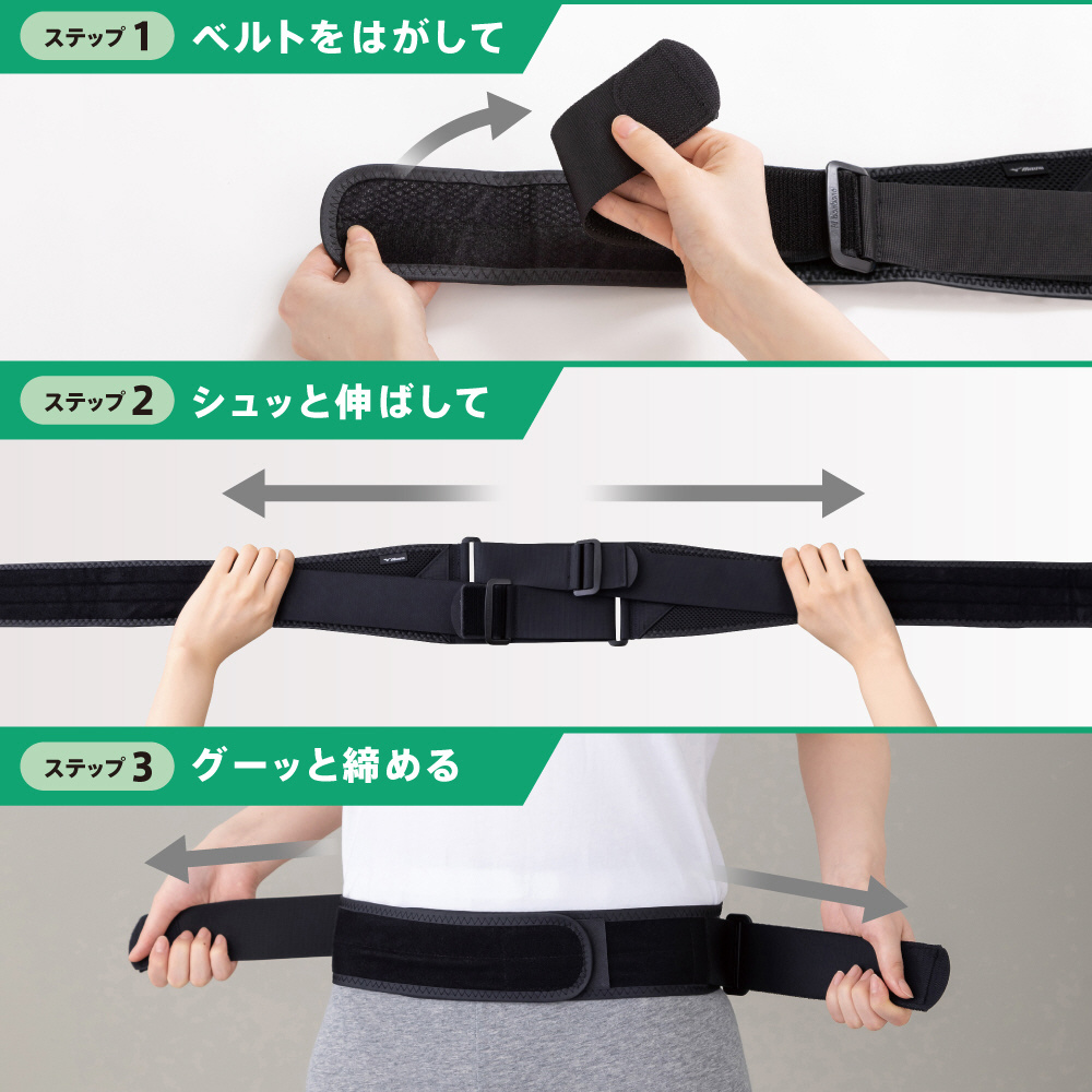 シリーズ累計50万本突破!(※)軽い力でグーっと締まる!骨盤をしっかり固定して、腰がラクに、動きがラクに。軽い力で驚きの固定力です。※2023年5月末現在