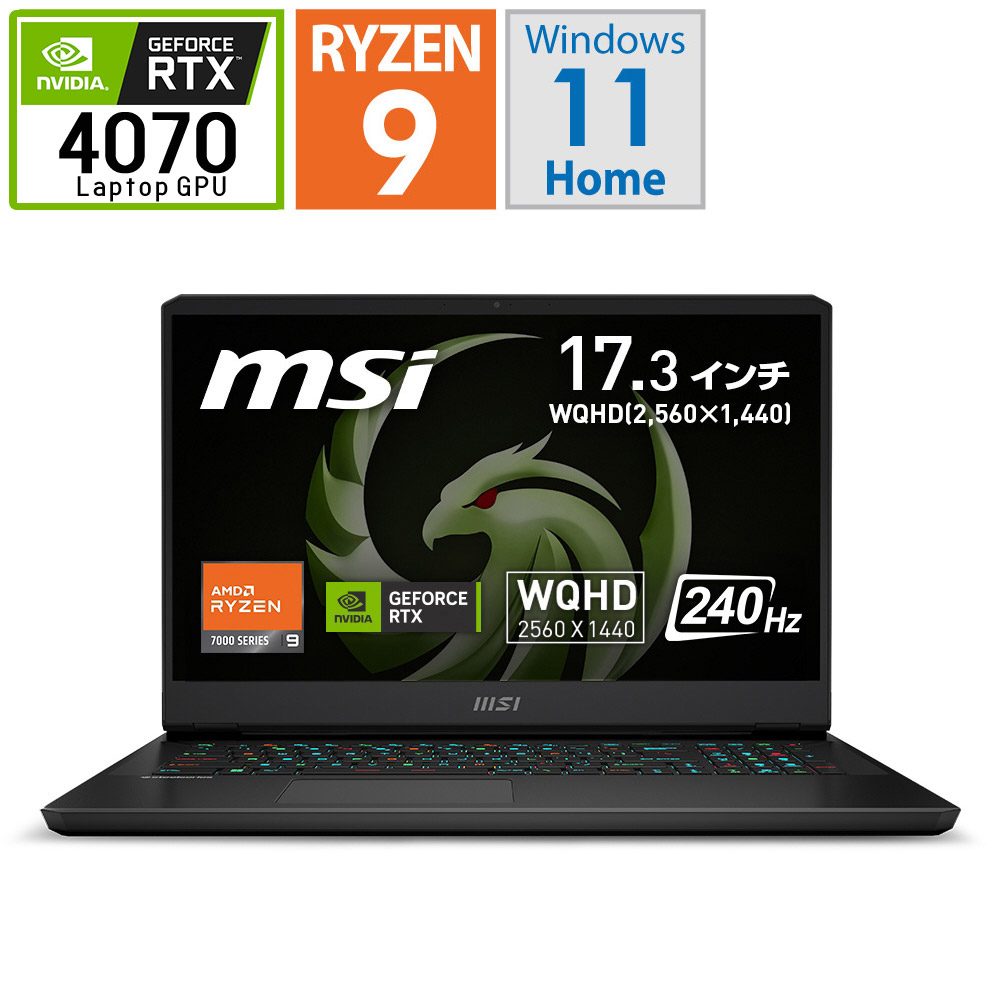 「Alpha 17 C7V」シリーズは、MSIノートPCシリーズで初の「Ryzen 9 7945HX」を搭載し、GPUに「GeForce RTX 40 シリーズ Laptop GPU」を搭載した性能重視のハイスペックタイプゲーミングノートPCです。