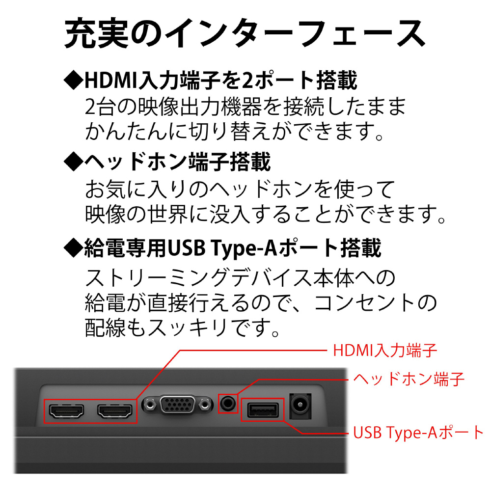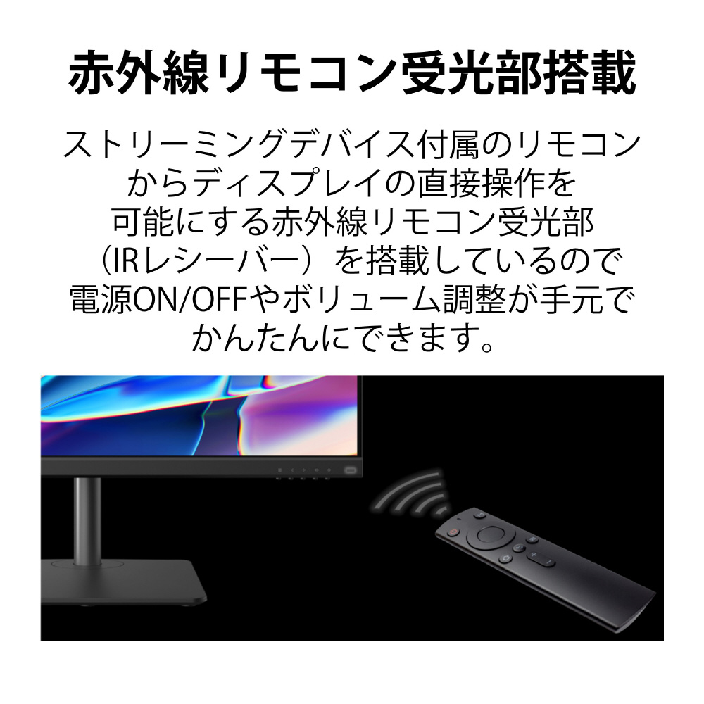 ストリーミングデバイスとの親和性を考えた、特別なインターフェース構成。デバイス付属のリモコンを使ったディスプレイの電源/音量調整が可能です。