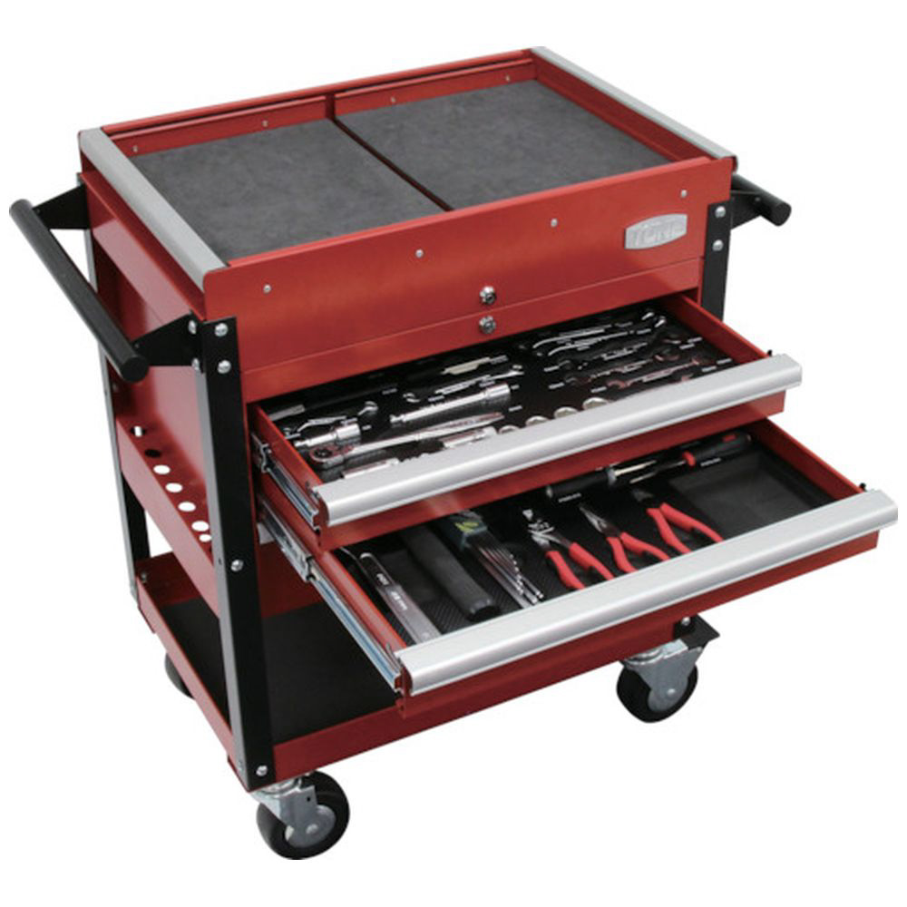天板スライドタイプで、収納・移動・作業性に優れている。引出し3段。サイズや製品番号表示で完璧な整理整頓と紛失防止を可能にする高級感あふれる専用カーボン調トレー採用。