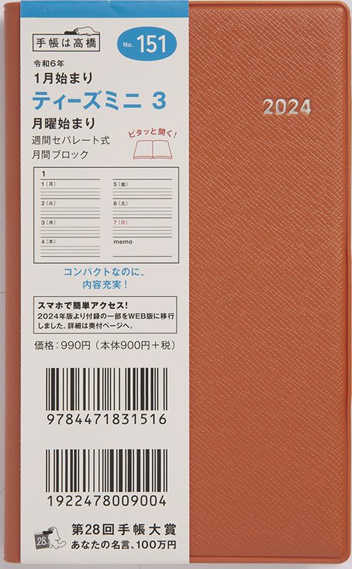 | 商品名 | 2024年版1月始まり T’mini(ティーズミニ)3 手帳 セパレート オレンジ No.151 [ウィークリー /月曜日始まり] |