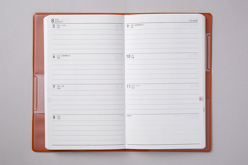 見開き1ページで1週間分のスケジュールを管理できるセパレート式。1日分の記入スペースが広いので、ちょっとした日記としてもご使用いただけます。