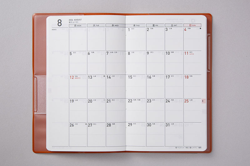カレンダーと同じ感覚で見ることができ、週ごとの予定が把握しやすいブロック式。平日の仕事の予定や、週末土日の予定をまとめて書きやすい月曜始まり。左端の一列はフリーのメモ欄になっています。月間が巻頭にまとまっているので、前後月との流れが把握しやすく便利です。