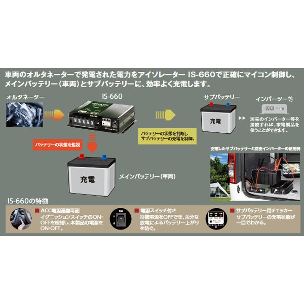 ●アイソレーター IS-660は自動車に搭載したサブバッテリーを走行中に充電するための製品です。