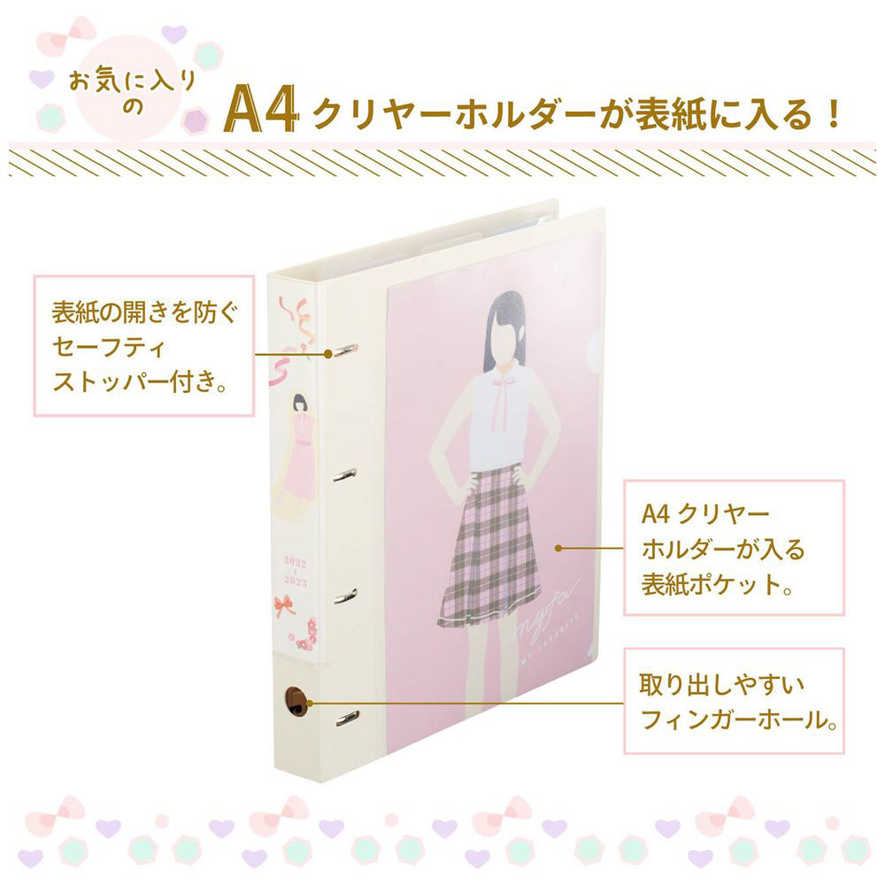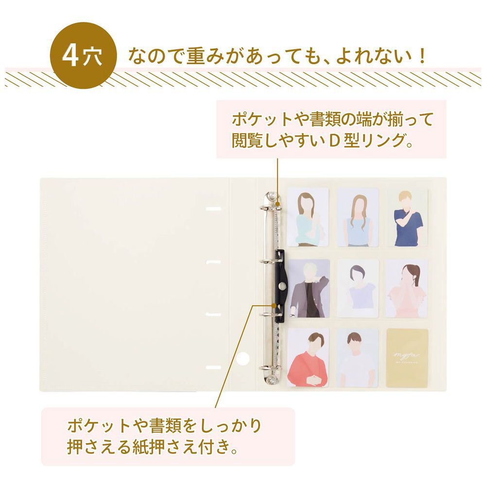 ポケットや書類の端が揃って閲覧しやすいD型リング。表紙の開きを防ぐセーフティストッパー付き。A4クリヤーホルダーが入る表紙ポケット。