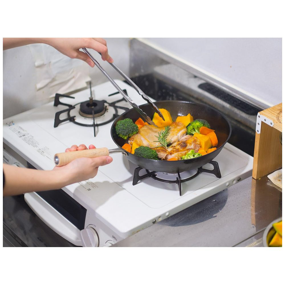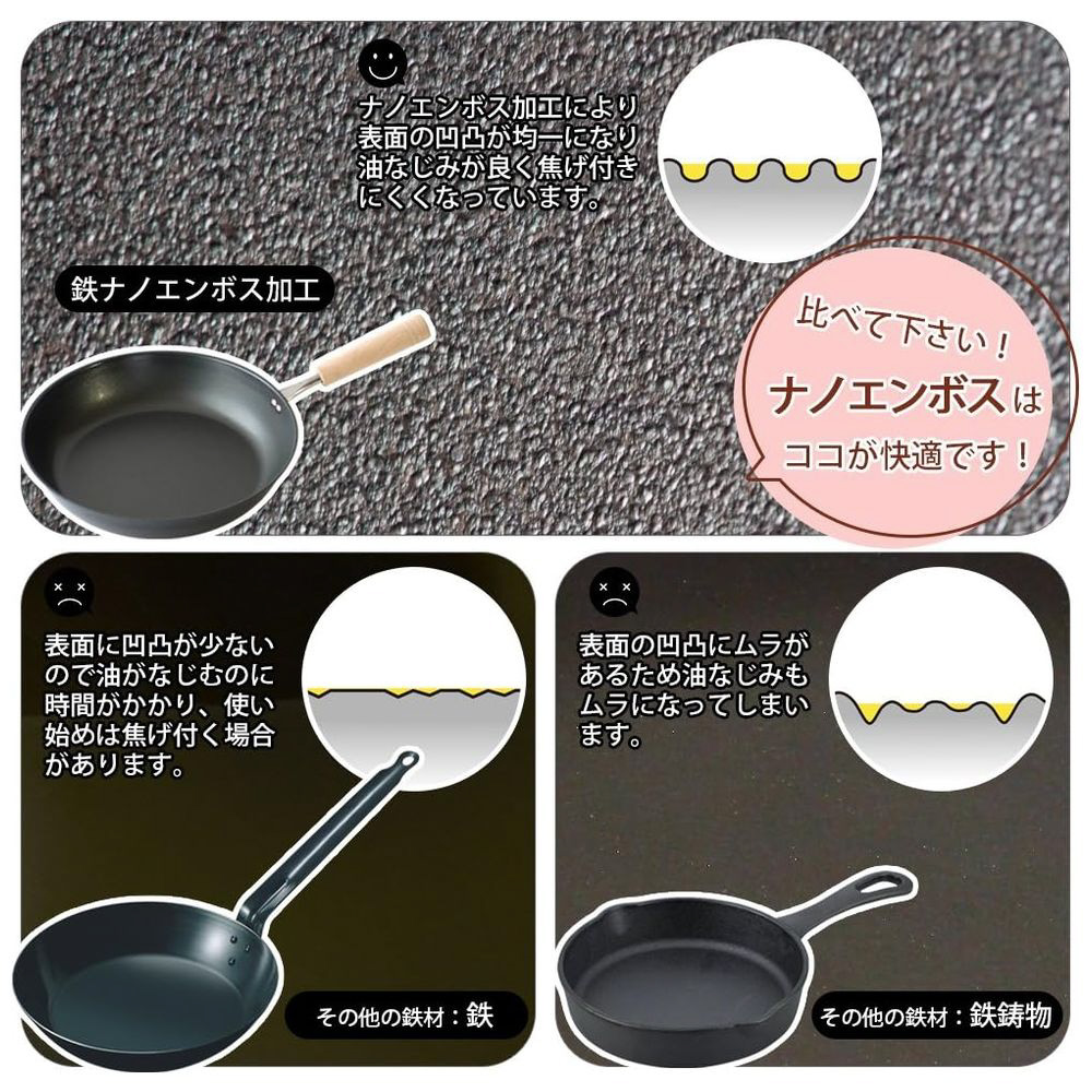 「ナノエンボス」加工で油なじみが良く、焦げ付きにくい鉄製フライパンです。
