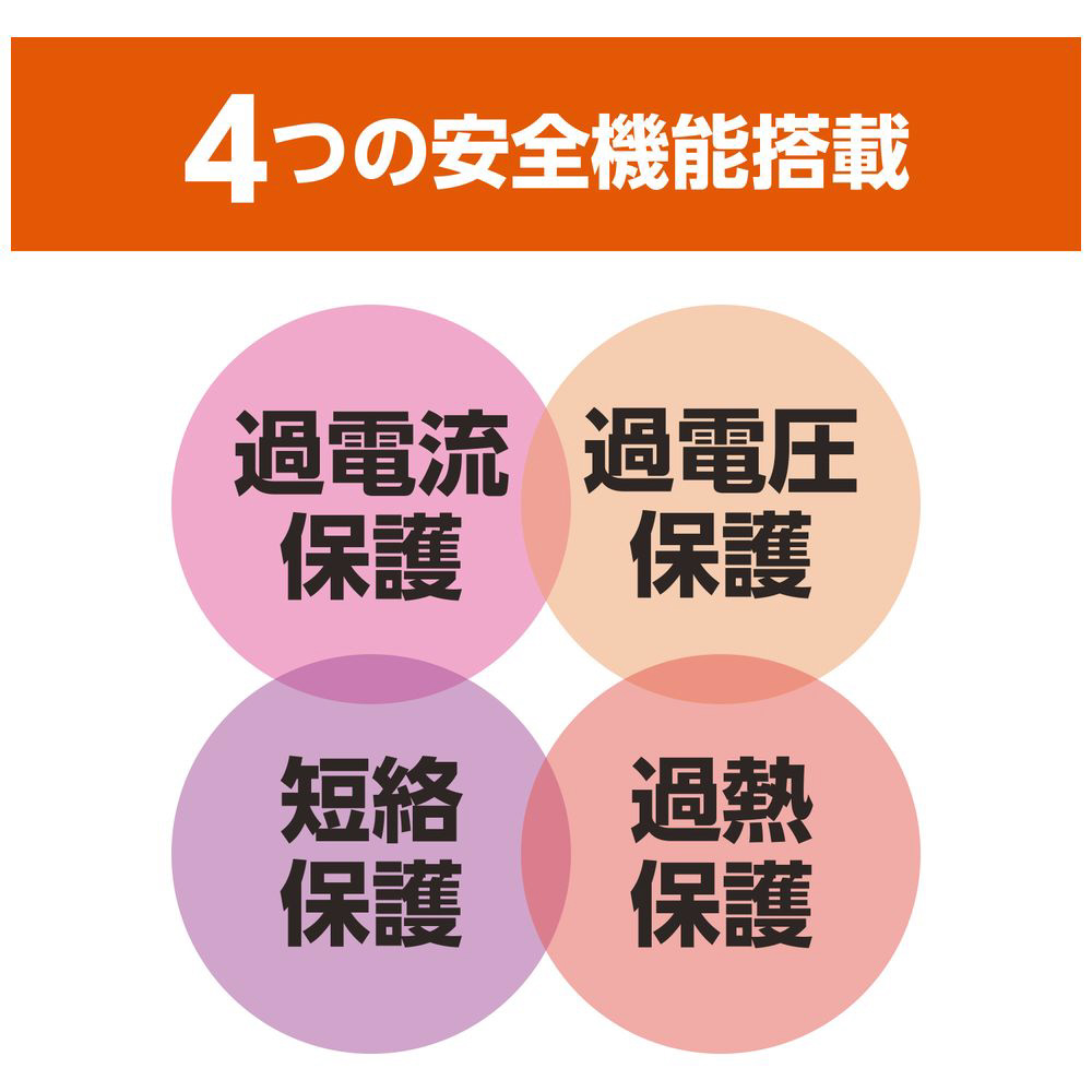 「過電流保護機能」「過電圧保護機能」「短絡保護機能」「過熱保護機能」の4つの保護機能を搭載し、