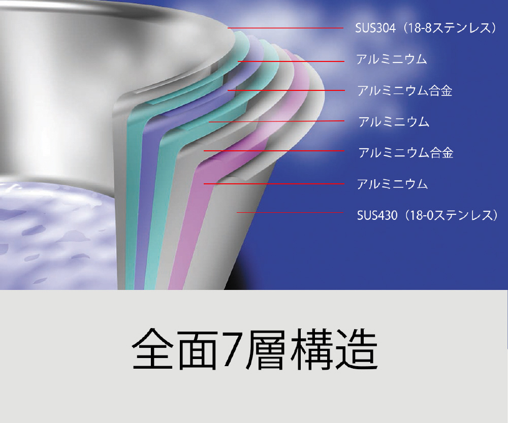 材質: 本体=全面7層構造(内側から18-8ステンレス/アルミニウム/アルミニウム合金/アルミニウム/アルムニウム合金/18-0ステンレス)