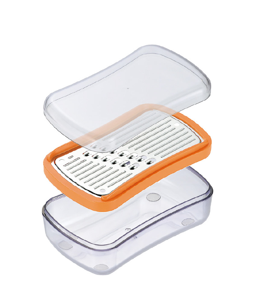 ●サイズ(約):75x125x50mm  ●重量(約):97g ●材質:刃部-ステンレス鋼/フレーム-ポリプロピレン(耐熱温度:110度)/フタ・容器/AS樹脂(耐熱温度:80度)/すべり止め-ゴム