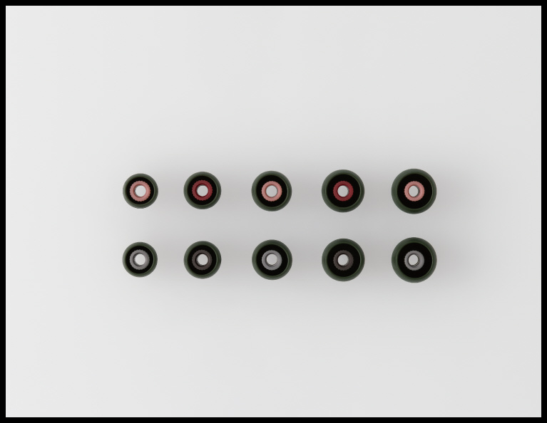 さらに、隣合うサイズの軸色が異なる(グレー軸は濃いグレーと薄いグレーの交互、赤軸は赤とピンクの交互)ため、サイズの判別もしやすくなっています。サイズはSS / S / M / L / LL の5サイズです。また、筐体と同色の「DARK OLIVE」となっています。