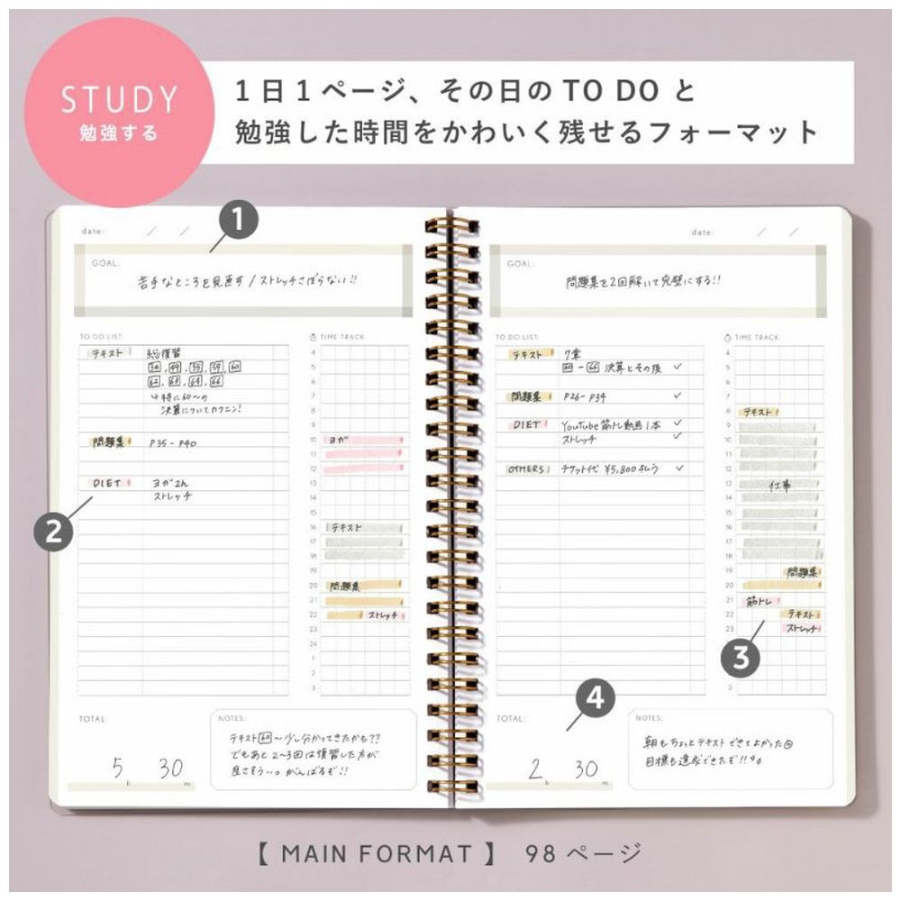 スタディプランナーは、毎日の勉強の記録を書き残すことで、計画的に楽しく勉強できる習慣を作る勉強専用の手帳。