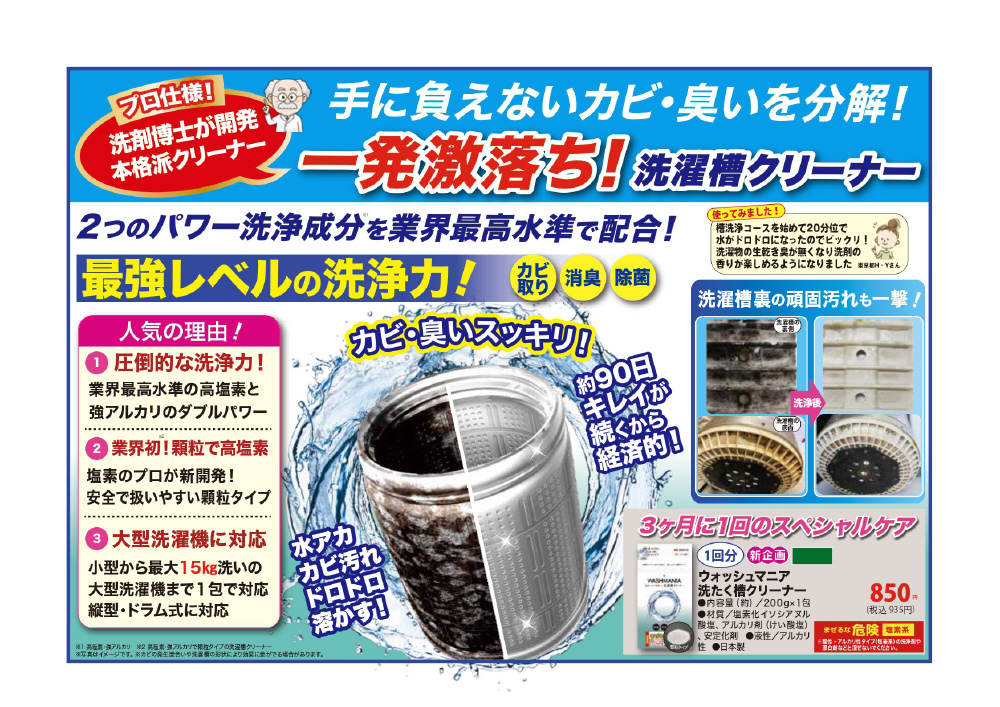 | 商品名 | WASHMANIA ウォッシュマニア洗濯槽クリーナー [ドラム式・縦型洗濯機対応 /塩素系] |