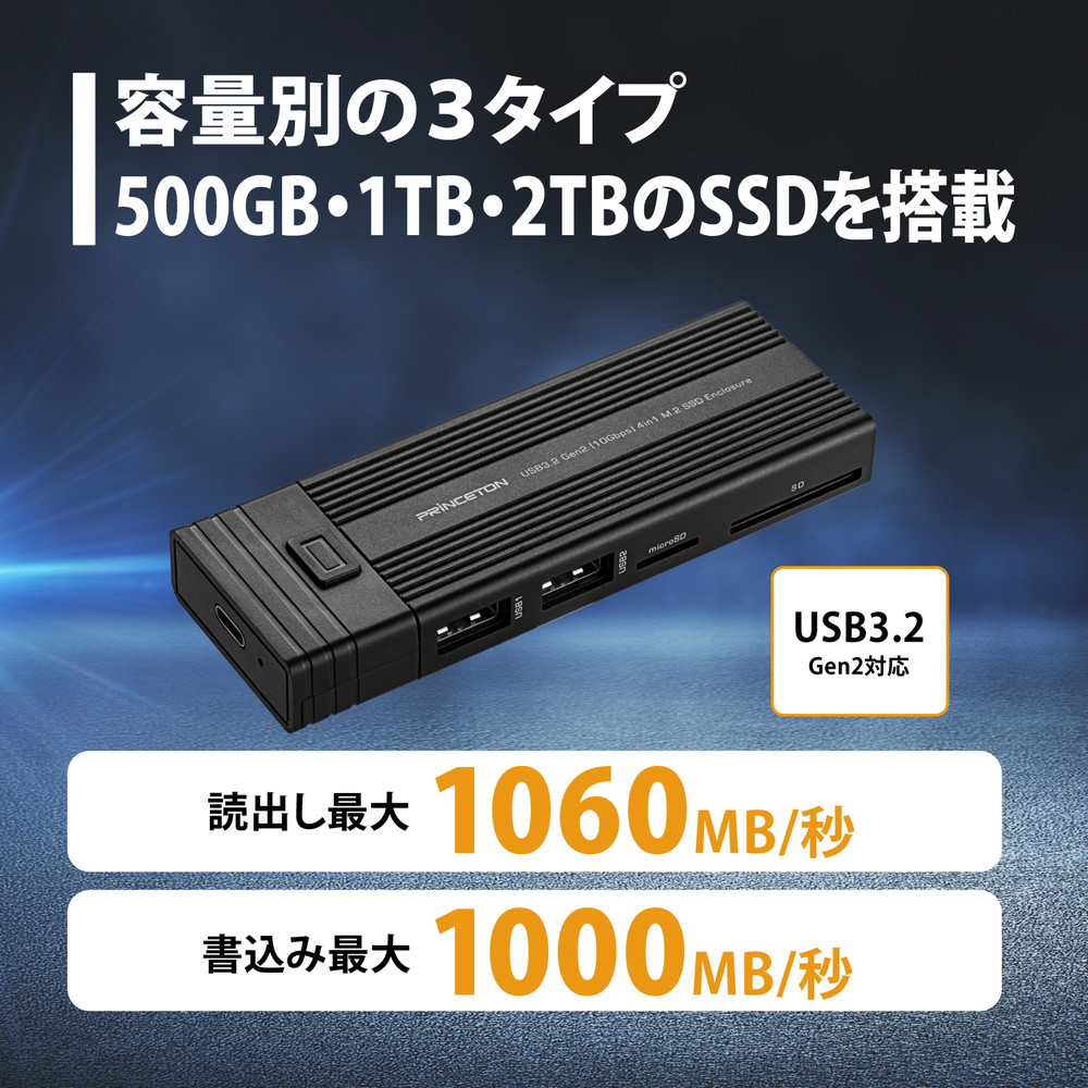 PRD-PSZEROUは4つのカードリーダーの機能が付いたポータブルSSD(M.2 SSD)です。SSDとして使用しながら、2つの「USB2.0ポート」、「SDカードスロット※」、「microSDカードスロット※」の機能を拡張できます。カードリーダーとしてのみの使用も可能です。内蔵SSDの容量は500GB/1TB/2TBの3種類をラインナップ。