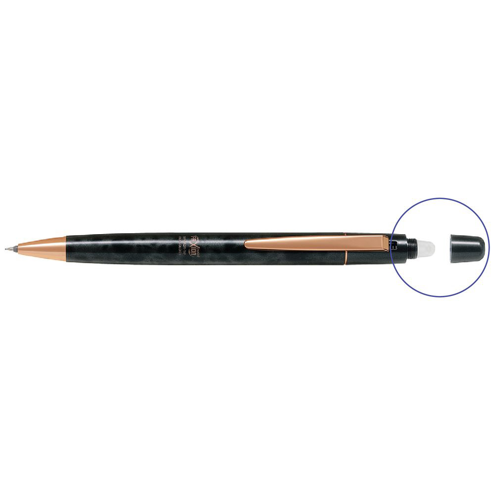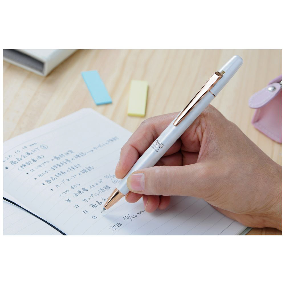 超極細の0.4mmのペン先で、手帳や資料などの細かい部分への筆記しやすく、ペン後部の消去用ラバーに頭冠を被せ高級感のある外観に仕上げました。
